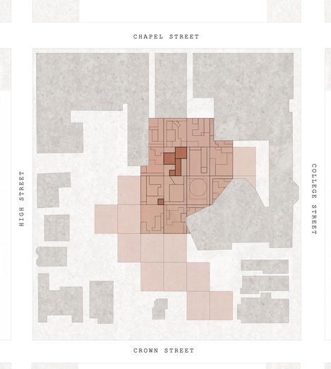 Play/Ground transforms an underutilized parking lot at Chapel and College Streets in New Haven into a playful urban landscape that engages the site’s layered history. Using fire insurance maps and GIS, the project traces past architectures to generate a grid of tiles, each marking moments of tension between built and unbuilt land. These tiles shape the site plan, introducing subtle reliefs into the earth. The structure itself mirrors this precarious layering, stacking masses to create a dynamic circulation system. By inviting the community to engage with these histories through play, Play/Ground offers a new framework for acknowledging, preserving, and reimagining urban land.